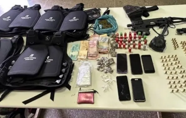 Com a dupla, os PMs apreenderam uma pistola calibre 40, um revólver calibre 38, quatro coletes balísticos, R$ 4,8 mil em espécie, munições, carregadores, porções de maconha, cocaína, crack, celulares, entre outros itens.