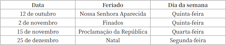 Já a Proclamação da República, comemorada em 15 de novembro, é o único feriado nacional a cair em uma quarta-feira. Entre os feriados nacionais, o Natal, último deles, cai em uma segunda-feira.