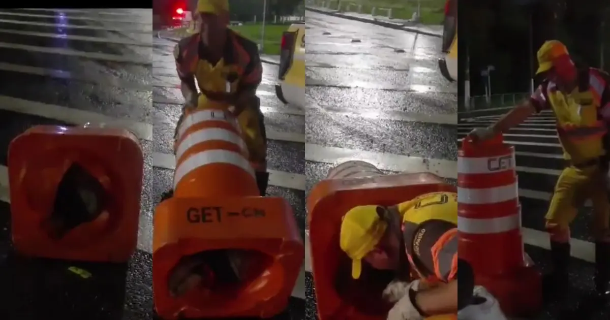 A CET afirmou que um agente, “ao recolher um cone que estava canalizando a Praça Campo de Bagatelle com a Av. Santos Dumont, às 22h30 do último domingo (29/10)”, “percebeu que o dispositivo estava mais pesado do que deveria”, e, “ao analisar o motivo, verificou que havia uma pessoa dentro do cone”.