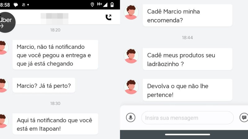 “Cadê minha encomenda, Marcio? Cadê meus produtos, seu ladrãozinho? Devolva o que não lhe pertence!”, pedia a cliente. A partir de então, de acordo com o motorista, uma discussão se iniciou. O profissional contou que decidiu devolver o produto à loja de origem e, em seguida, finalizar a corrida.
