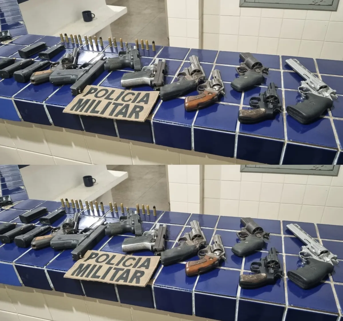 Em uma edificação, os dez homens foram cercados e capturados. Com eles foram apreendidos seis revólveres calibres 38 e 32, três pistolas calibres 9mm e 380, carregadores e munições.