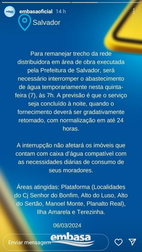 Em nota divulgada através de suas redes, a Embasa informa que o serviço tem previsão de ser concluído à noite e que o fornecimento da água deverá retornar gradativamente com a normalização entre até 24 horas.