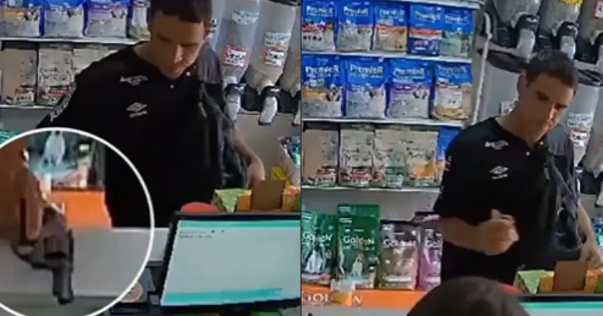 Câmeras de segurança flagraram um homem assaltando um pet shop no bairro do IAPI, em Salvador, na tarde desta quinta-feira (2). Nas imagens, é possível ver que o suspeito chega ao estabelecimento com uma mochila, onde ele anda pela loja e depois vai até ao balcão, tira uma arma da mochila e anuncia o roubo.